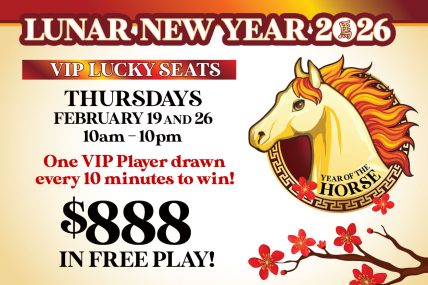 VIP players, join us Thursdays, February 19 and 26 from 10am-10pm! One VIP player will be drawn every 10 minutes to win $888 in Free Play! Receive one automatic entry each promotion day and earn additional entries for every 250 slot tier points* (or equivalent table games play) earned!